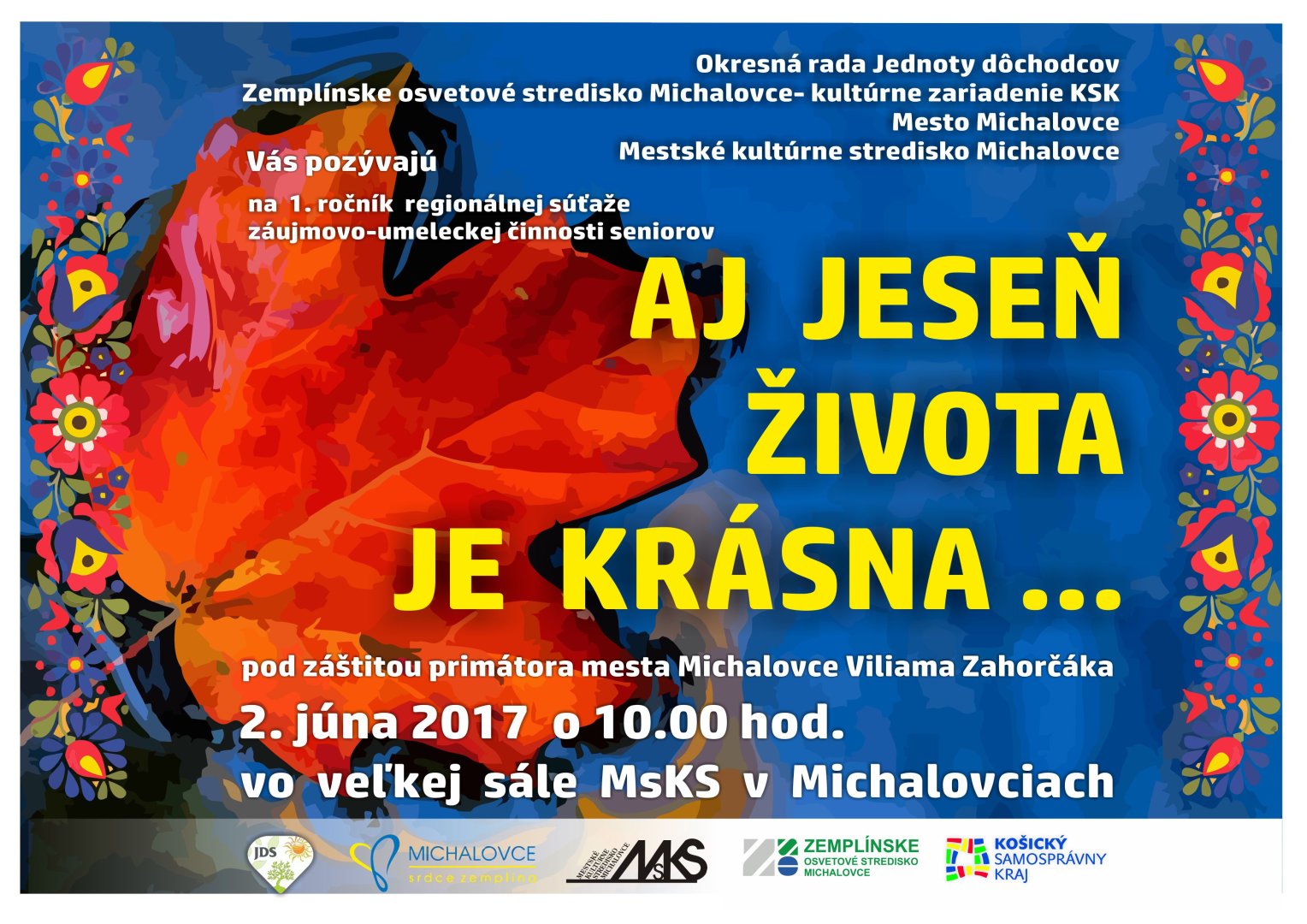 Okresná rada Jednoty dôchodcov v Michalovciach v spolupráci s Mestom Michalovce, MsKS v Michalovciach a Zemplínskym osvetovým strediskom v Michalovciach pripravili 1. ročník regionálnej súťaže záujmovo-umeleckej činnosti seniorov - členov Jednoty dôchodcov - Aj jeseň života je krásna...